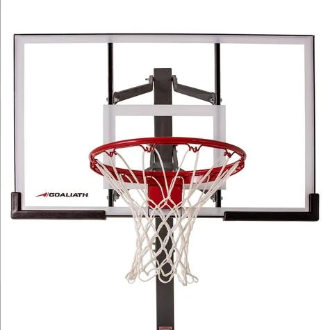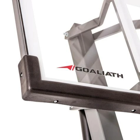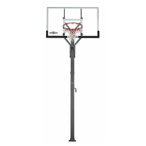 The Goaliath GB50 basketball hoop system comes with a powder-coated steel pole and a 127 x 84Â cm backboard. The hoop system is anchored directly in the ground and reinforced with poured concrete to increase stability.
