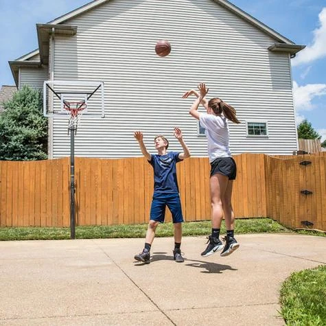 The pro-style breakaway hoop is delivered partially pre-assembled, which means you’ll be ready to play in no time at all. The hoop contains springs on the hoop ring that bend under stress. Just like in official NBA hoops, this technology prevents the backboard from shattering or players getting injured by excessive stresses.