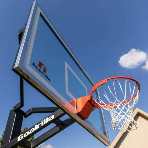 The transparent look and perfectly balanced rebound off the backboard of the GS72C will make you play like the pros. The GS72C comes with a 183 x 102Â cm tempered glass backboard, which receives stabilising support from a one-piece 15 x 15Â cm hoop pole. Just like all Goalrilla basketball hoop systems, the GS72C offers a stepless and quick height-adjustment from 2.3Â m to the official NBA and FIBA hoop height of 3.05Â m. A powder-coated exterior protects the hoop system from wind and weather, promising uncompromised quality and stability in any weather conditions.
