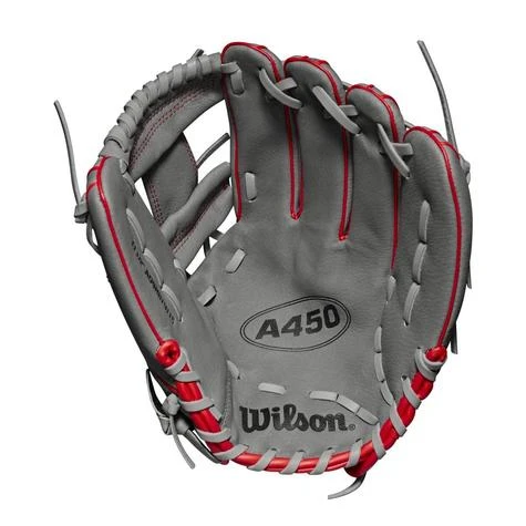 The A450 line of Wilson gloves are designed to look like Pro Stock model gloves worn by some of the top players in Major League Baseball. This Grey and Red 11.5″ H-Web model is perfect for young players looking to develop their skills.